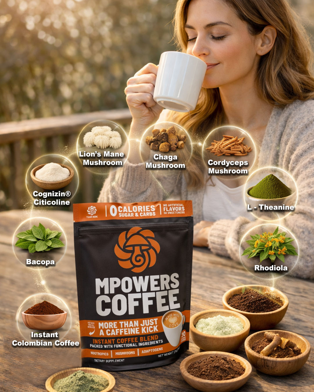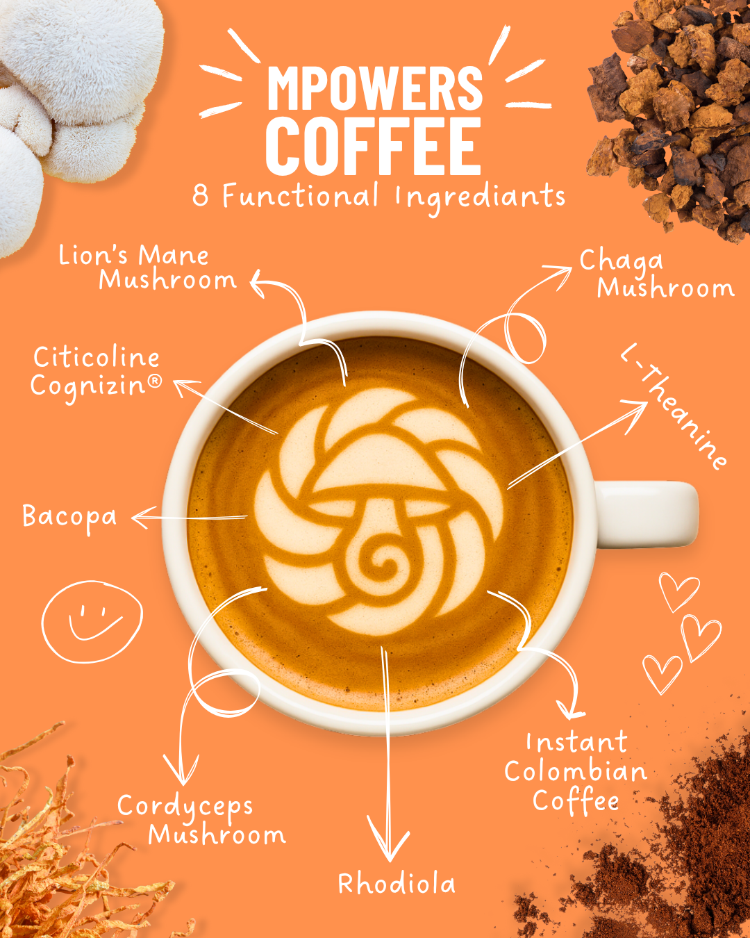 Colombian instant coffee + Cognizin® Citicoline, Lion’s Mane, Chaga, Cordyceps, L-Theanine, Rhodiola, and Bacopa. All natural. No fillers.
