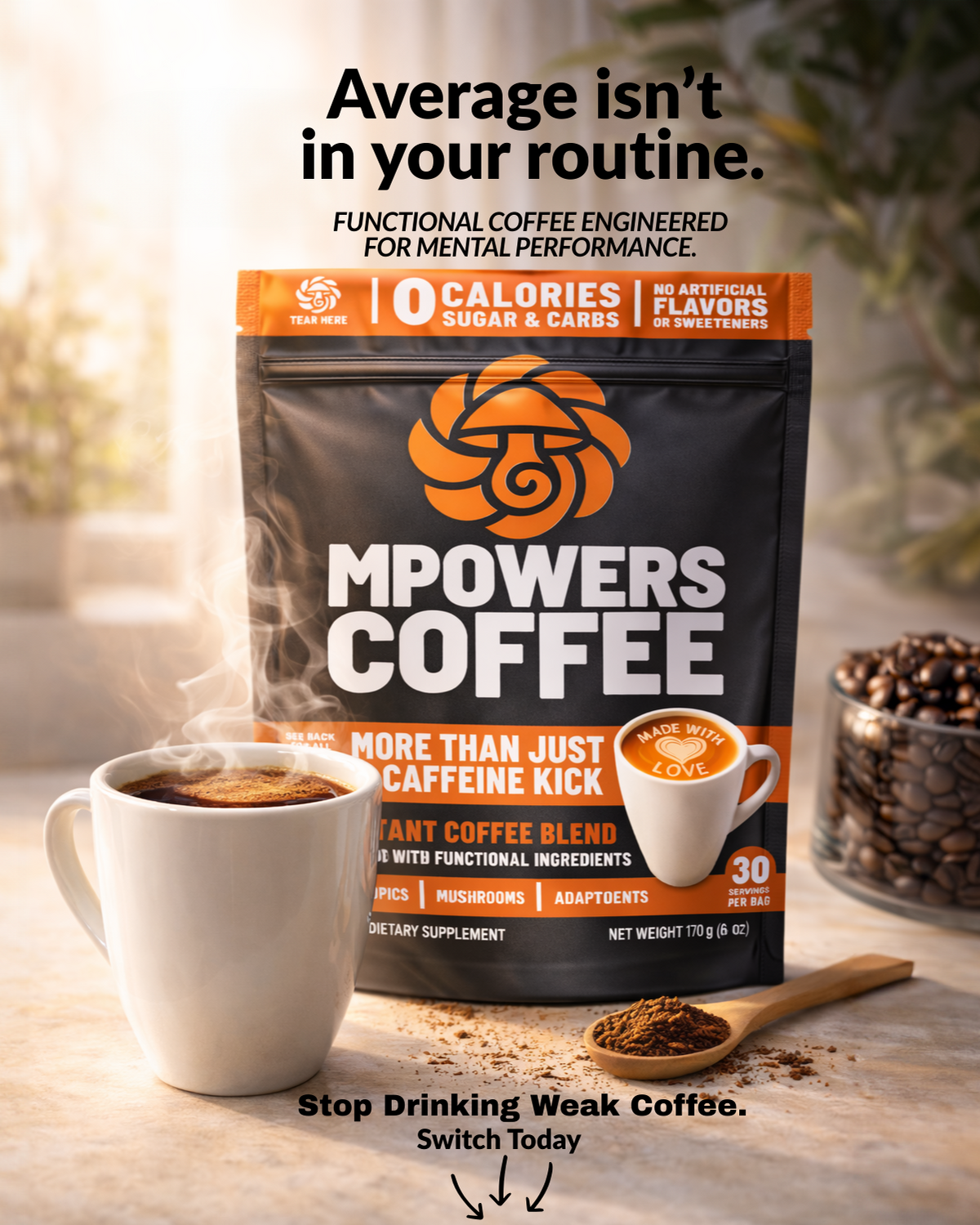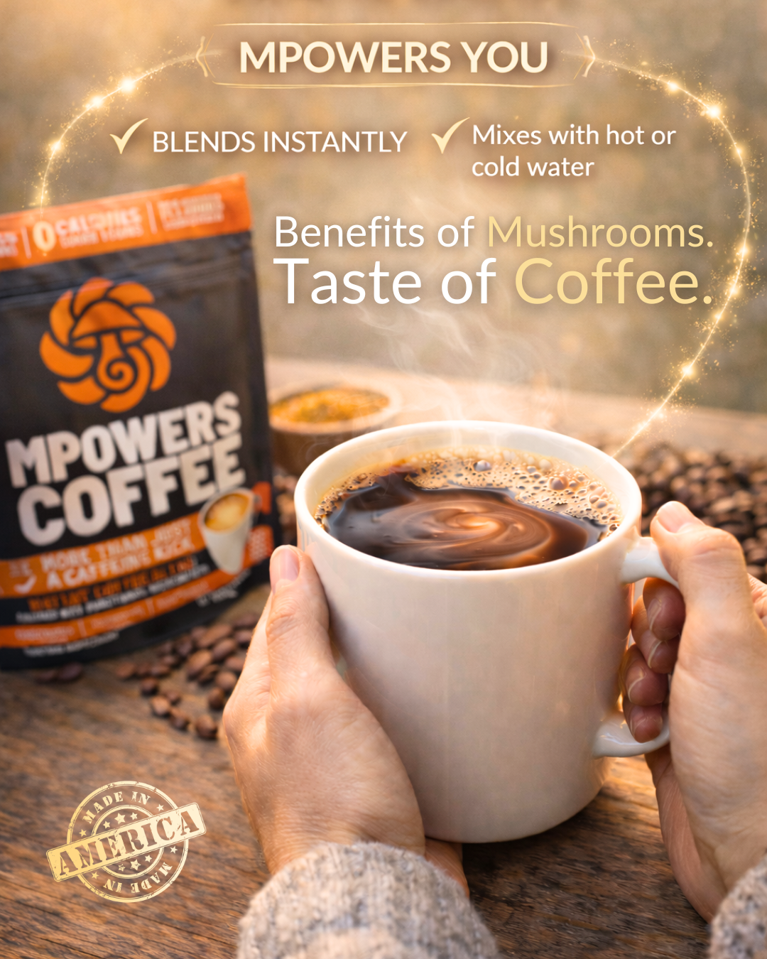 Unlike standard coffee, MPowers is crafted for sustained, balanced energy. The natural caffeine works in synergy with adaptogens to boost stamina, reduce stress, and promote calm focus! No jitters, no midday crash.